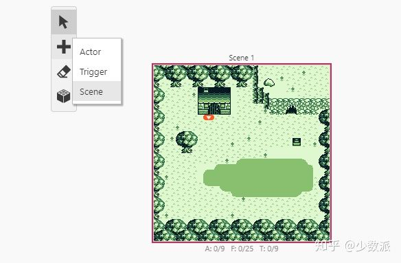 在游戏故事板中,你可以随意添加场景,并将人物放置在上面。在添加了一个空白场景后,你可以在右侧的编辑栏中修改它的名字、背景等属性,并为其添加脚本。要想在场景上放置人物或开关(Trigger),只要在悬浮菜单中选择对应的选项即可。人物的属性设置与场景相同,你可以修改它的坐标来让它生成在不同的位置。
