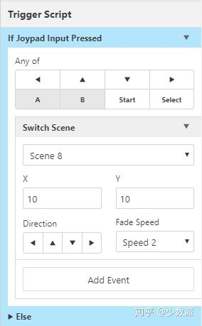 要添加开关脚本,你需要先添加一个开关,随后在右侧选择「添加事件」。与人物互动需要玩家按下按键,而默认情况下,只要人物站在开关上,它就会启动。因此,如果你希望让玩家在按下按键后才开始互动,则需要在脚本中加上「当玩家按下按键」(If Joypad Input Pressed),并将互动脚本放置在这个 If 条件中。