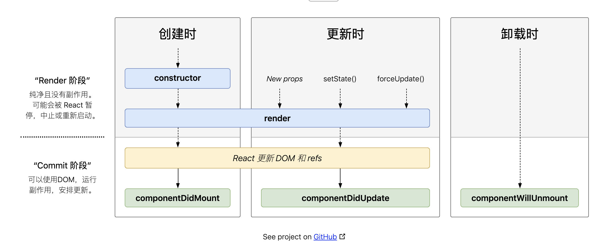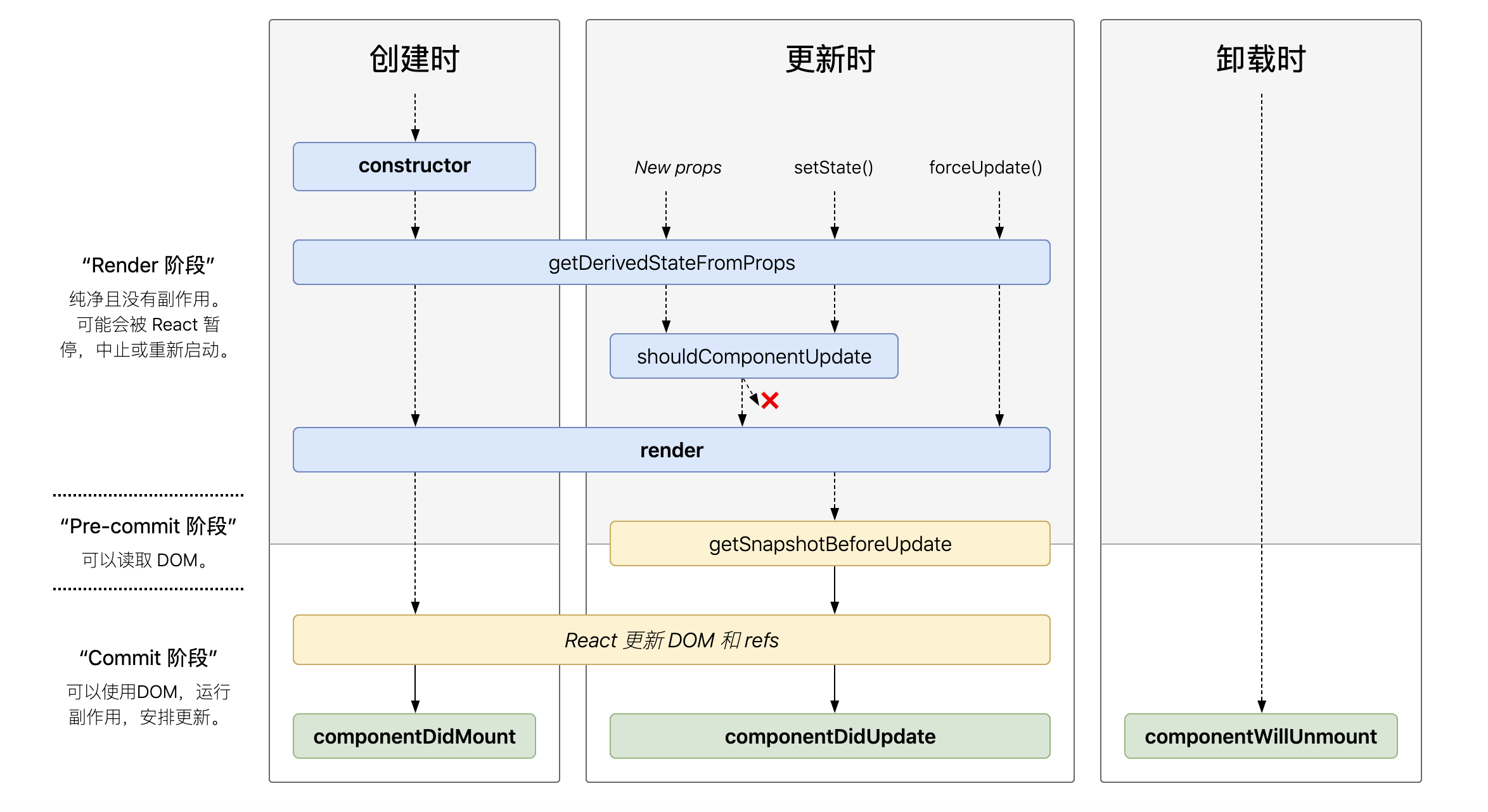 getSnapshotBeforeUpdate() 在最近一次渲染输出(提交到 DOM 节点)之前调用。它使得组件能在发生更改之前从 DOM 中捕获一些信息(例如,滚动位置)。此生命周期的任何返回值将作为参数传递给 componentDidUpdate()。