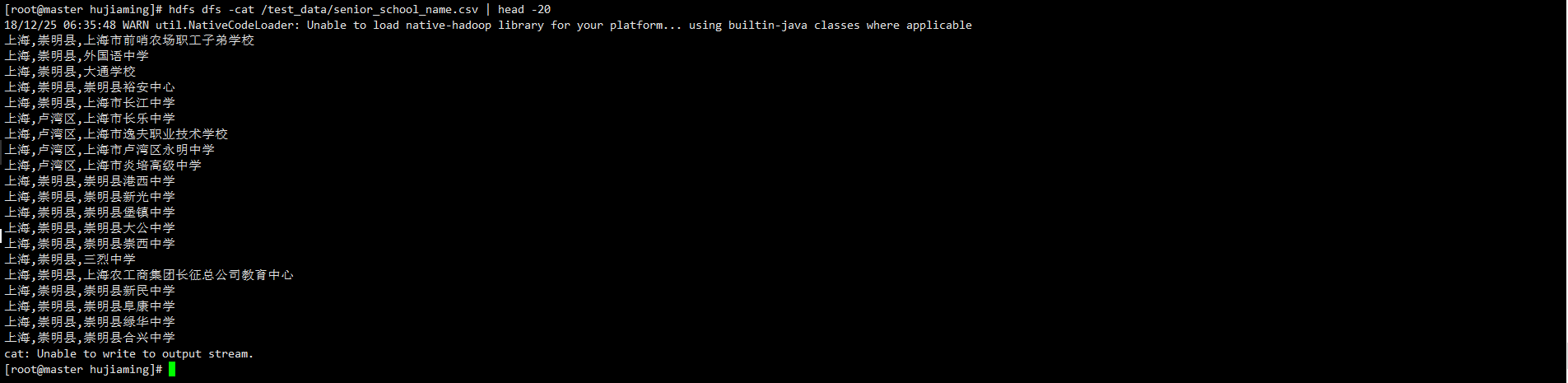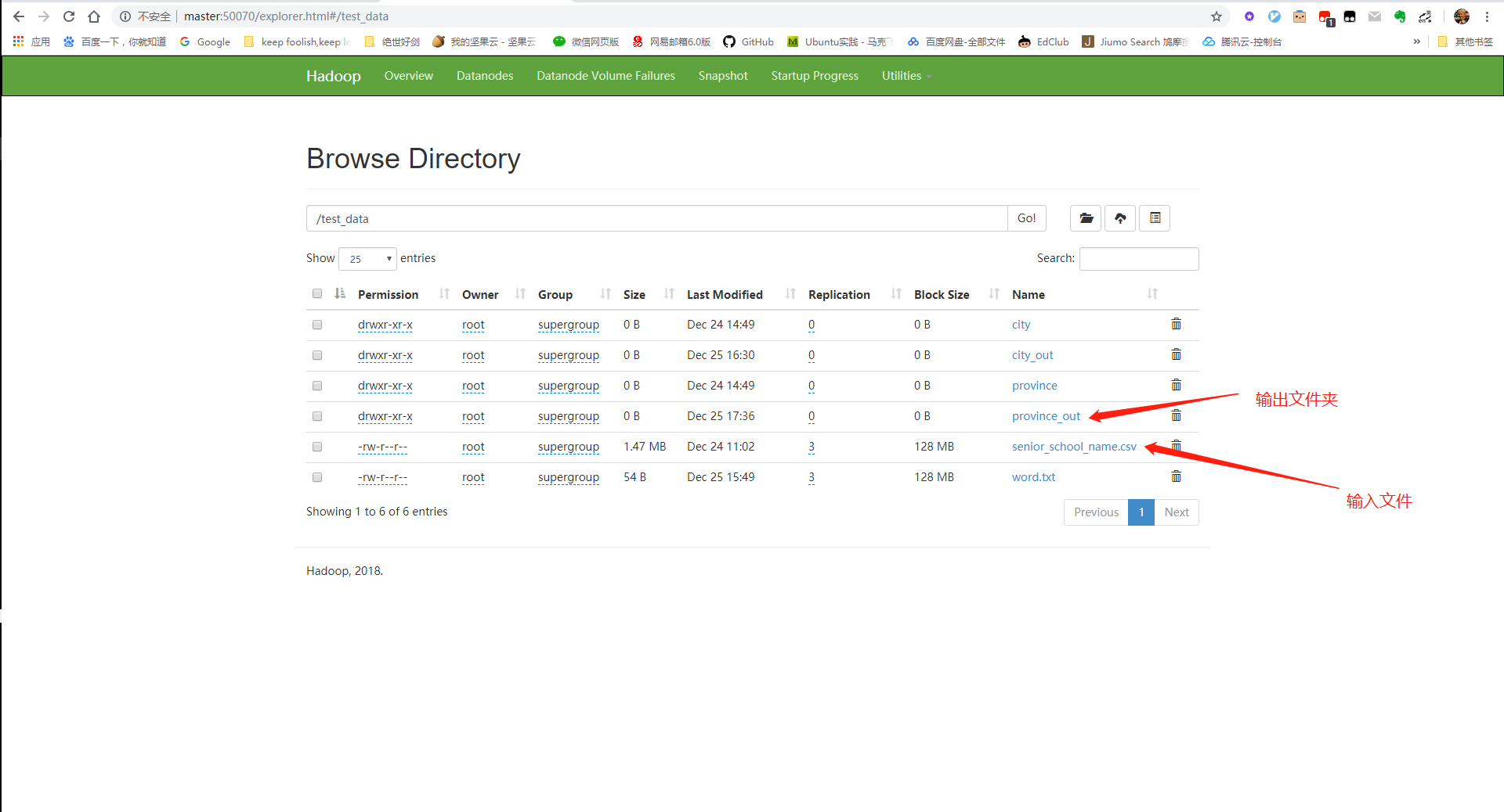 打开每一个namenode的UI界面,可以发现至少有一个namenode处于active状态,另外的处于standby状态。需要注意的是,处于standby的节点,没有open权限,也就是说不能查看集群上的具体文件结构。 这个时候已经启动了HA集群,可以做个实验:将master1直接kill -9,然后发现master1的namenode进程退出,而master2的状态由standby变成active。