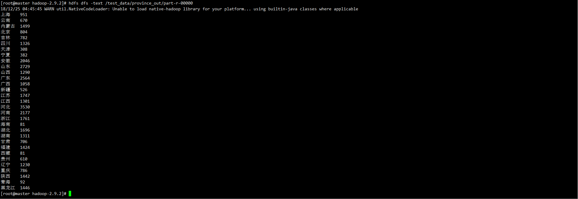 combine可以理解成一个mini reducer,它发生在spill到本次磁盘过程之前,目的就是把送到reducer的数据实现进行一次计算,以减少文件大小、减少对网络带宽的消耗。但是要注意的是,combine操作是可选的,如果要加上,请务必保证经过combine之后的数据不会对最终的reduce结果产生影响。下面我们执行combine: