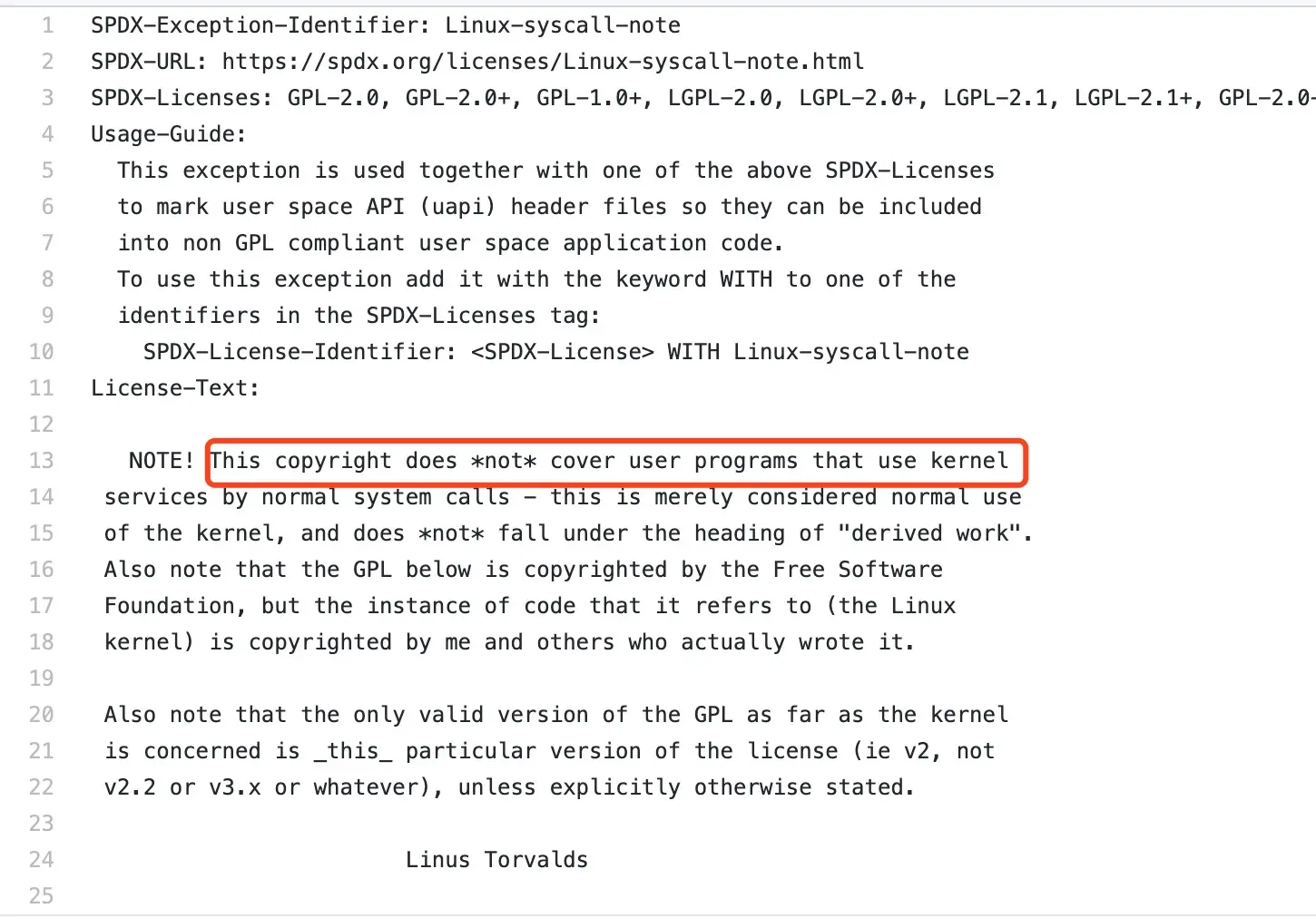 首先说明,“传染性”的边界在哪?Linux 内核的作者 Linus 以及内核开发人员多次强调普通系统调用为不是 GPL 的作用范围。大家在 Linux 内核的源码 COPYING 文档中也可以找到这些文字。这些为 Linux 用户空间的程序采用非 GPL 的授权许可证打好了基础。
