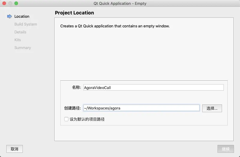 - 输入项目名称 AgoraVideoCall,并选择项目路径;