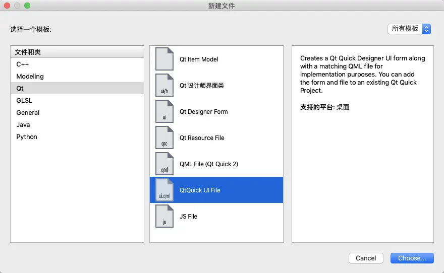 - 在项目上点击右键,并选择 Add New,选择 QtQuick UI File 模板;