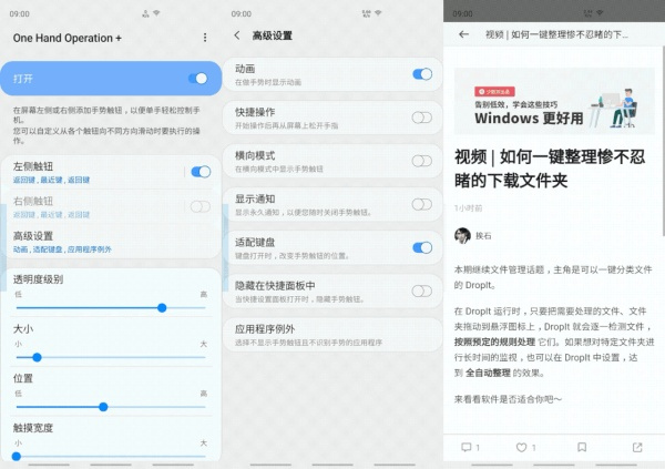One Hand Operation +,则为 One UI 带来了类似 MIUI 的全面屏手势。启用后,你可以从屏幕边缘触发区向内侧划动返回、向上划动进入多任务界面,不用费心找准位置。触发区域的透明度、位置、大小等都可以自由调节,不影响 App 正常交互,可以说是所有三星用户必备工具。