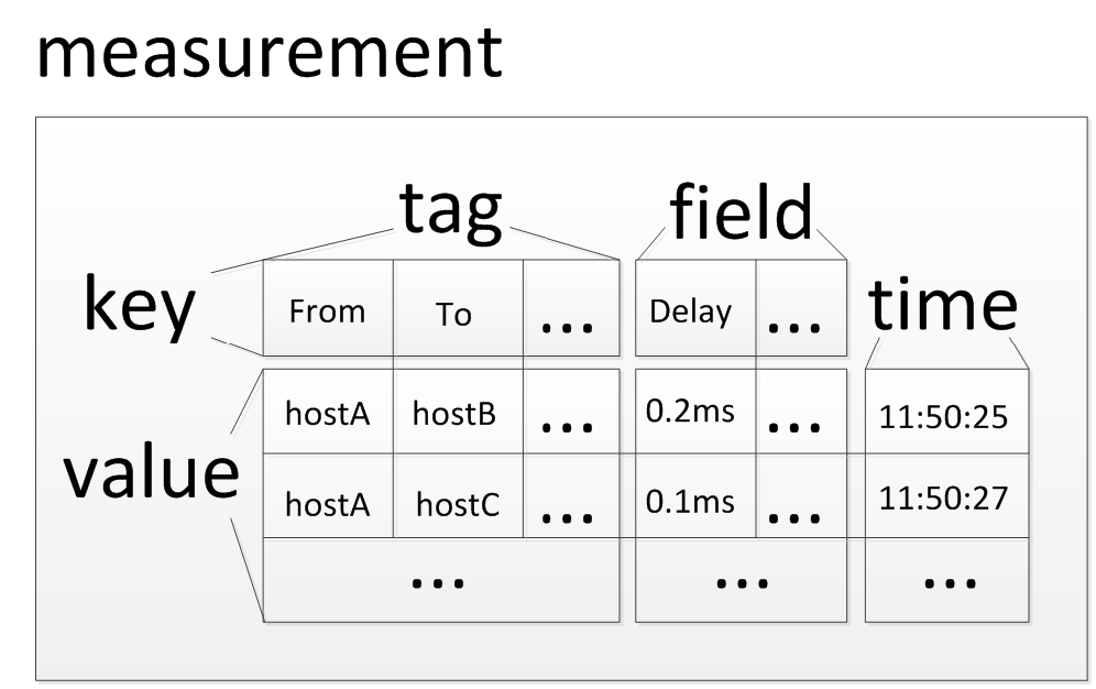 measurement展示出来第一行是key,剩下的可以看成value,这样tag有tagkey,tagvalue,field有fieldkey和fieldvalue。