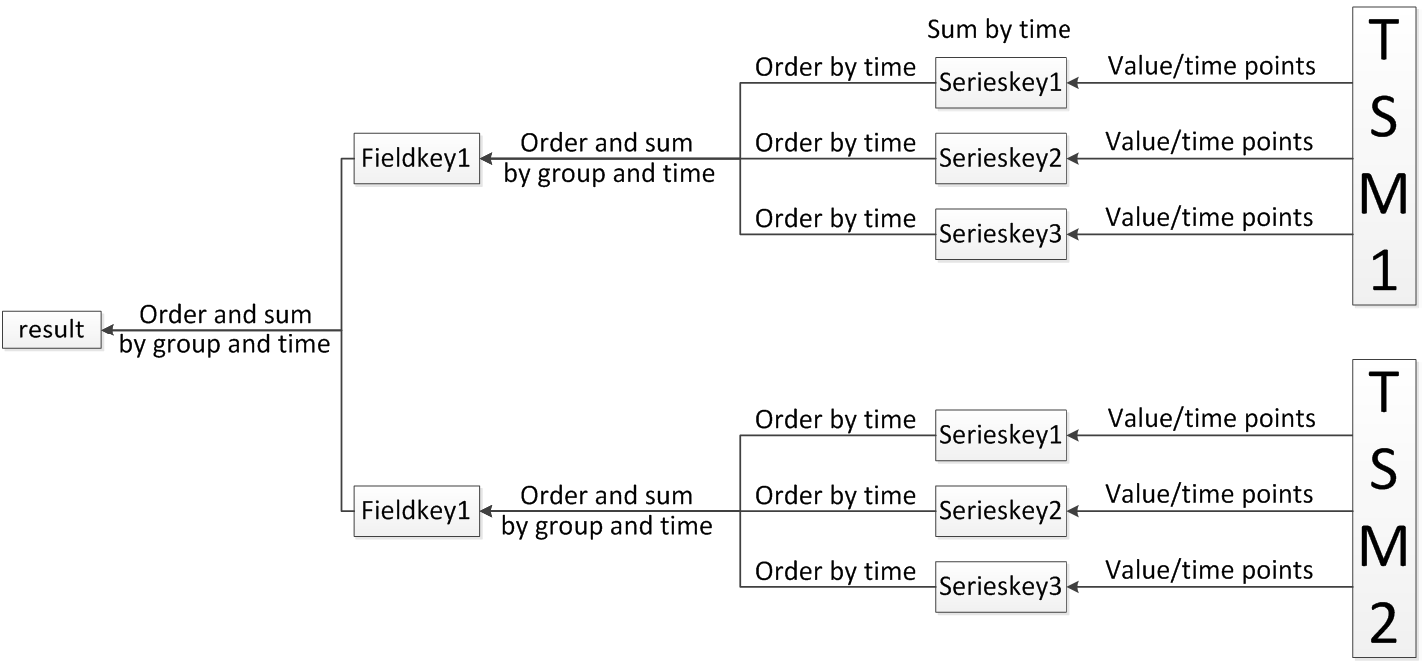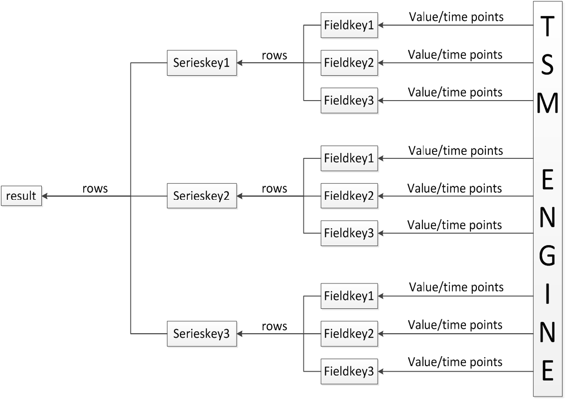 不带聚合函数的查询:如图,对于一个serieskey,需要拼接众多的fieldkey,进而取出多个列的数据,他们出来后面临的问题是怎么组合为一行的数据,influxdb行列约束比较松散,不能单纯按照列内偏移确定行。Influxdb把serieskey和time作为判断列数据为一行的依据,每一个serieskey对应的多列就汇集为一个以多行为粒度的数据流,多个serieskey对应的数据流按照一定顺序汇集为一个数据流,作为最终的结果集返回到客户端。