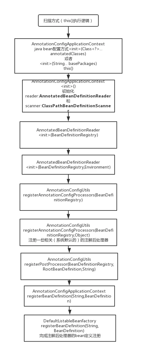 1.初始化的时候都会调用默认无参构造器初始化AnnotatedBeanDefinitionReader和ClassPathBeanDefinitionScanner,初始化 AnnotatedBeanDefinitionReader的时候会注册一些BeanFactoryPostProcessor(该接口的实现能够对BeanFactory再一次处理)类 型的BeanDefinition,这些Bean是spring能够通过注解加载bean的关键。下面是根据调用链画的流程图