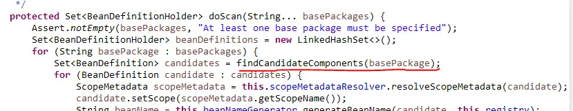 2.不管传入的参数是java配置类还是包路径,最终都会调用ClassPathBeanDefinitionScanner的doscan方法,下面看一代码