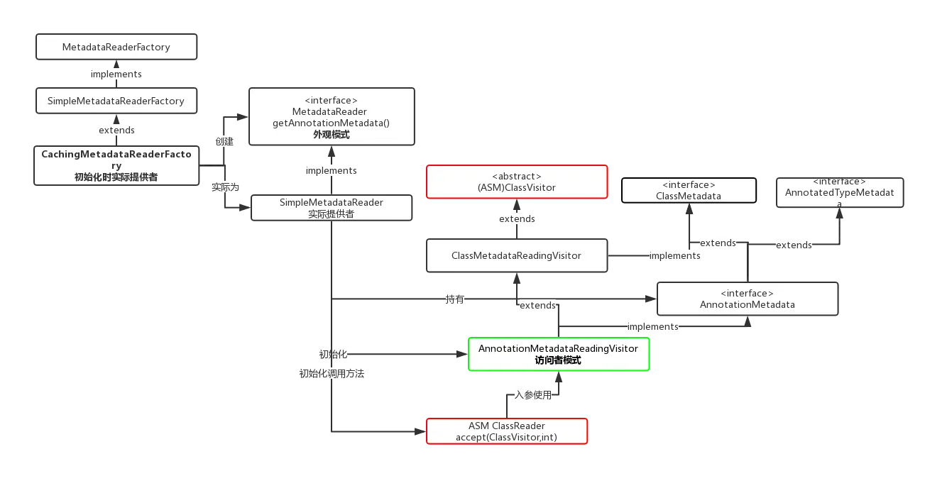 spring中通过ASM字节码操作库来读取类信息和注解信息,这里最关键的类是MetadataReader的实现类SimpleMetadataReader, 所有的操作都在这个类中处理。下面是调用关系