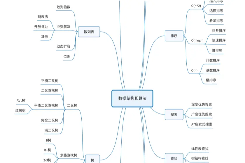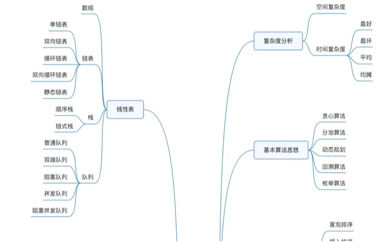 - 10种数据结构(数组、链表、栈、队列、散列表、二叉树、堆、跳表、图、Trie树)和10种常用算法(递归、排序、二分查找、搜索、哈希算法、贪心算法、分治算法、回溯算法、动态规划、字符串匹配算法)