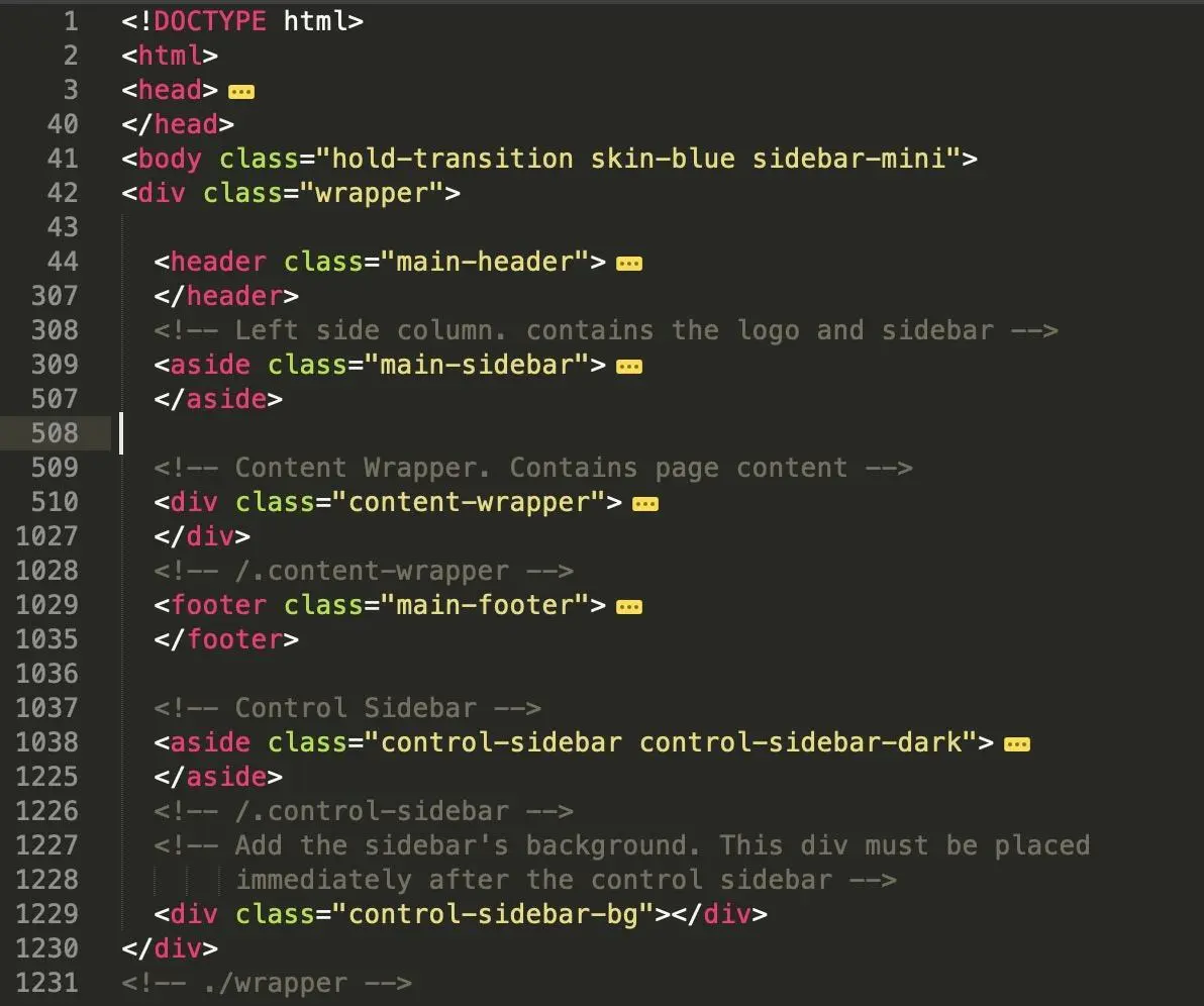 相信你一眼就能看出上面这段代码的意思,将一个页面拆分后,再重组,这就是最终的首页。其他的所有页面都可以通过这样的方式,进行重组,我们要写的代码,仅仅只是修改 <div class="content-wrapper"></div> 里的页面即可。