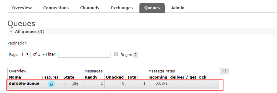 示例代码中,我们新建了1个非持久化的Exchange,1个非持久化的Queue,并将它们做了绑定,此时运行代码,Exchange和Queue新建成功,消息‘durable exchange test’也被正确地投递到了队列中:
