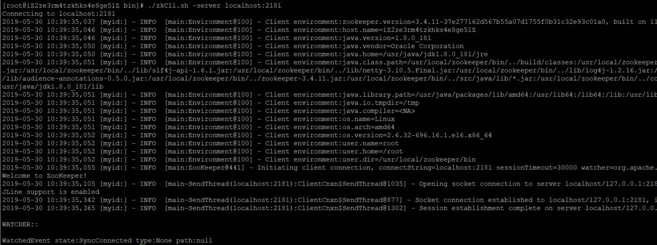 进入安装 ZooKeeper文件夹的 bin 目录下执行下面的命令连接 ZooKeeper 服务(Linux环境下)(连接之前首选要确定你的 ZooKeeper 服务已经启动成功)。