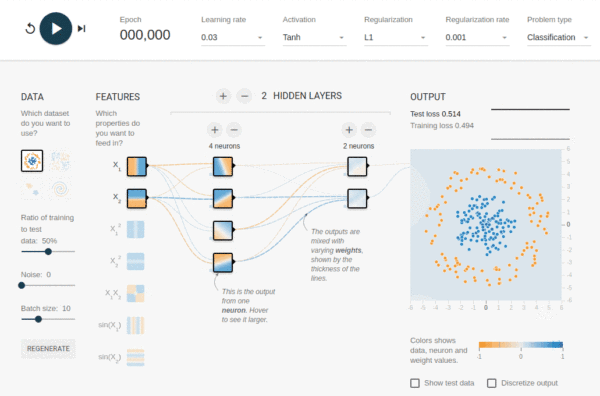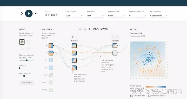 如果你选择的是分类问题,即可看到明显的边界变化以及loss在不断减小的情况,点击show test data可以显示未参与训练的test数据集的情况,点击Discretize output可以看到离散化后的结果。