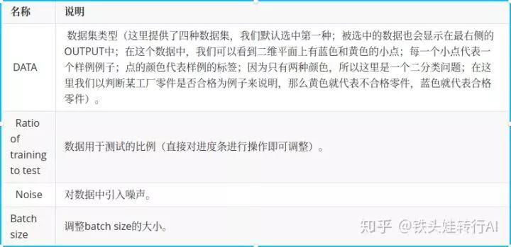 DATA 数据集类型(这里提供了四种数据集,我们默认选中第一种;被选中的数据也会显示在最右侧的OUTPUT中;在这个数据中,我们可以看到二维平面上有蓝色和黄色的小点;每一个小点代表一个样例例子;点的颜色代表样例的标签;因为只有两种颜色,所以这里是一个二分类问题;在这里我们以判断某工厂零件是否合格为例子来说明,那么黄色就代表不合格零件,蓝色就代表合格零件)。
