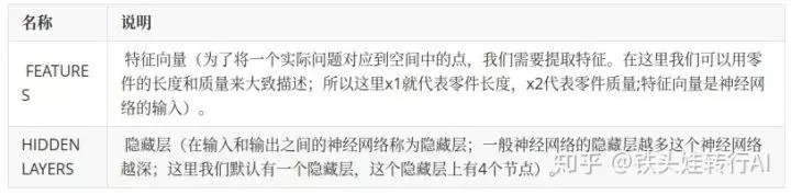 FEATURES 特征向量(为了将一个实际问题对应到空间中的点,我们需要提取特征。在这里我们可以用零件的长度和质量来大致描述;所以这里x1就代表零件长度,x2代表零件质量;特征向量是神经网络的输入)。