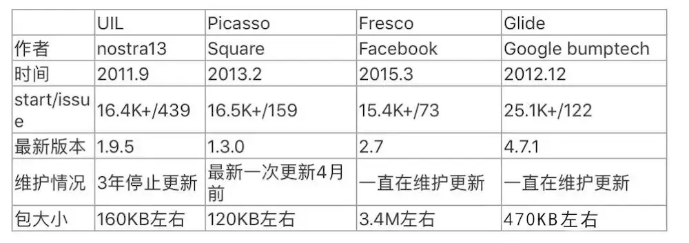抛开BitmapFun不提,我们看下4个框架的对比,