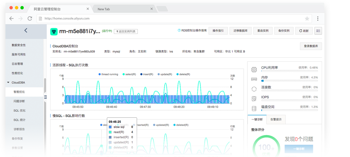 产品控制台中,实时监控实例硬件使用指标、慢SQL,并给出各种优化建议。帮助用户快速定位并解决问题。