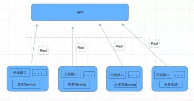 App和多个后端系统直连,只要一个系统出问题,就会影响App的可用性,比如酒店服务出了问题比如变慢或者耗用CPU过多资源,其机票服务或者其他服务会受到一定影响,其典型的弊端就是缺乏故障隔离机制,缺少负载均衡、缺少监控、缺少熔断等影响后端稳定性的问题,导致App的健壮性很差,非常脆弱。