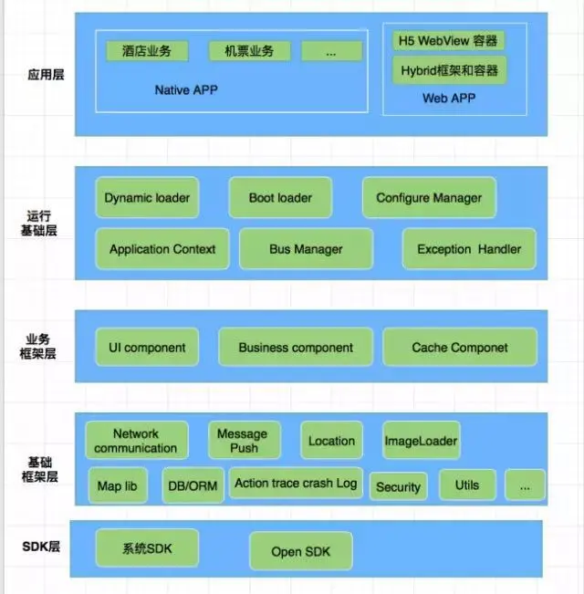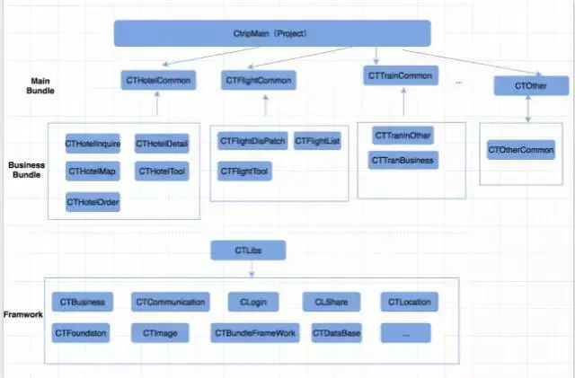 进行功能解耦的重要思想,就是实行轻重分离,主次分明的思想;在代码模块的组织架构上进行重要的调整,保证主要重要的App功能快速迭代和性能稳定,将附属的使用频率不高的新功能,使用H5容器进行动态加载,所以在V2.0的架构上,携程App就是个典型的Hybrid App ,可以看到刚开始就核心模块酒店和机票采用Native 进行开发,其他模块基本是采用H5去实现。