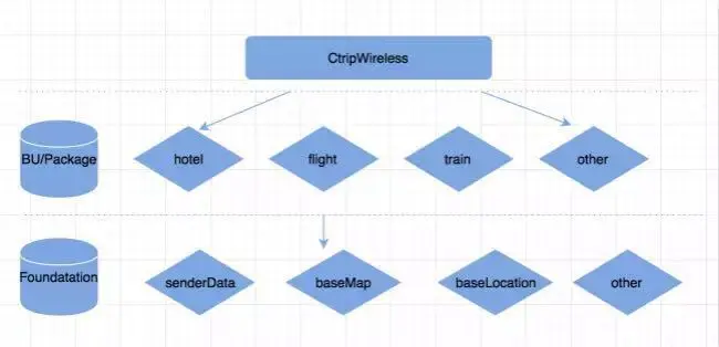 但是这种架构在开发的后期会由于其超高耦和性,从而造就庞大Controller层,而这也是一直被人所诟病。最终的MVC都从Model-View-Controller走向了Massive-View-Controller的终点,其最严重的结果就是Control层的代码越来越多,在携程内部很多类,早期都超过了2000行,同时Control层和View层之间存在一些较高的耦合。其对应的App工程结构架构如图5所示:当时无论iOS和Android工程,都只有一个工程结构CtripWireless。