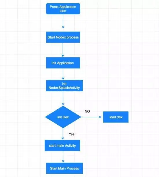 加载Dex逻辑也非常简单,由于NodexSplashActivity的intent-f ilter指定为Main与LAUNCHER。首先拉起nodex进程,然后初始化NodexSplashActivityActivity,若此时Dex已经初始化过,即直接跳转到主页面。