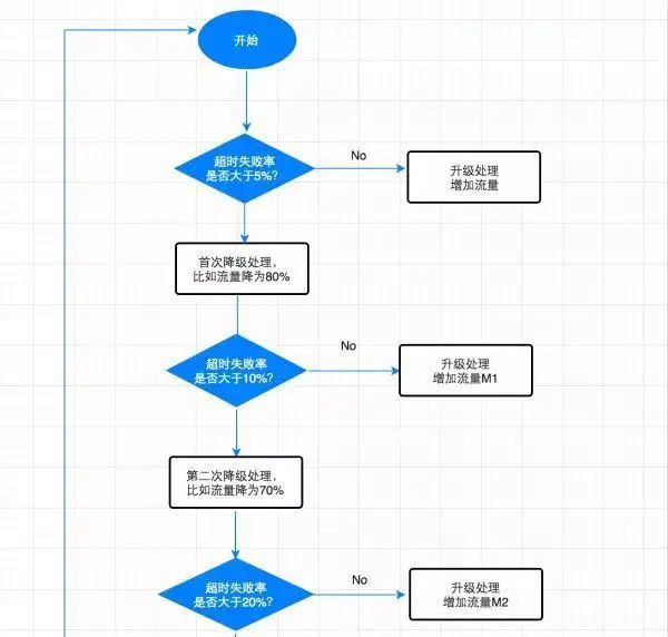 针对特定一个接口,如果在一定时间间隔内(比如5分钟),它的超时失败率到了一定比例(比如5%),网关会对该接口做降级处理,随机抛弃部分流量,比如只允许50%流量通过。下一个5分钟再评估,如果失败率还没有改善,允许通过的流量降到25%,以此类推。如果成功率好转,网关对该接口做升级处理,提升通过的流量比例,为了快速恢复,一般提升到原流量4倍,然后在下一个时间段再评估是否触发升降级。