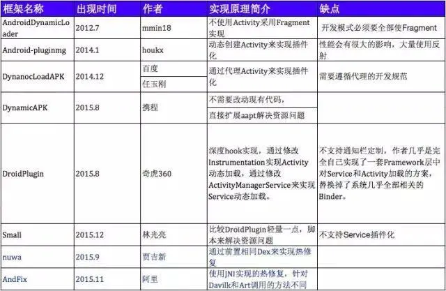 为了一劳永逸解决我们V2.0遇到的Dex方法数超标的问题,我们内部基于目前携程App的现状研发实现了一个动态加载的插件化框架DynamicLoader,支持即时加载,按需加载,远程加载三种方式。即时加载,即刚开始就直接加载进来,按需加载是使用的时候才去加载,远程加载即刚开始没有这个工程,然后用户通过远程安装就可以直接使用这个功能。这种机制同时也支持了我们后续使用到了Hotfix机制。在这里首先简单总结下目前市场上出现了比较著名的开源的插件化框架如表1所示。