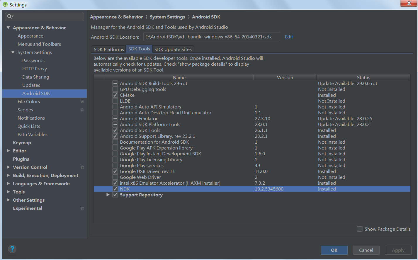 我用的AndroidStudio的版本是3.2.1,在创建Project时如果选中了支持C++,AndroidStudio就会自动去网上帮我们下载NDK的开发环境,具体情况可以通过File->Setting->Appearance & Behavior->System Setting ->Android SDK->SDK Tools查看,主要看的就是NDK和CMake两项是否安装: