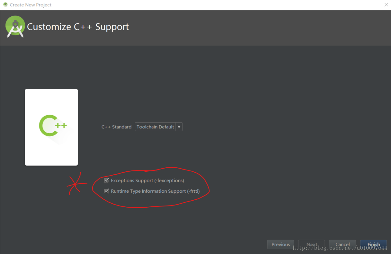 Exceptions Support:如果您希望启用对 C++ 异常处理的支持,请选中此复选框。如果启用此复选框,Android Studio 会将 -fexceptions 标志添加到模块级 build.gradle 文件的 cppFlags 中,Gradle 会将其传递到 CMake。