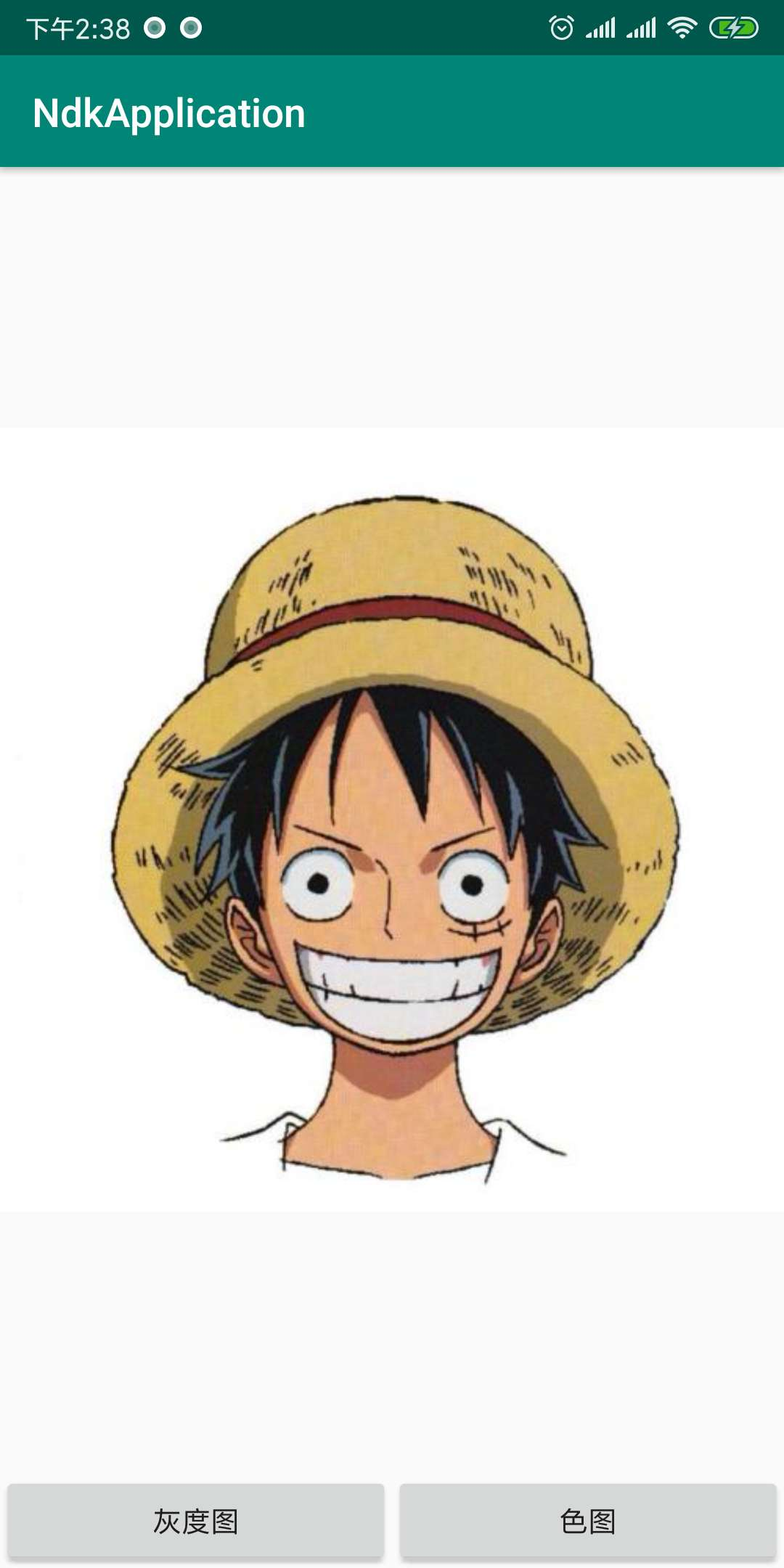 <?xml version="1.0" encoding="utf-8"?> <LinearLayout xmlns:android="http://schemas.android.com/apk/res/android" xmlns:app="http://schemas.android.com/apk/res-auto" xmlns:tools="http://schemas.android.com/tools" android:layout_width="match_parent" android:layout_height="match_parent" android:orientation="vertical" tools:context=".MainActivity"> <LinearLayout android:layout_width="match_parent" android:layout_height="wrap_content" android:layout_weight="1" android:orientation="vertical"> <ImageView android:id="@+id/image" android:layout_width="match_parent" android:layout_height="match_parent" android:layout_weight="1" app:srcCompat="@drawable/lufei" /> </LinearLayout> <LinearLayout android:layout_width="match_parent" android:layout_height="wrap_content" android:orientation="horizontal"> <Button android:id="@+id/button_2" android:layout_width="match_parent" android:layout_height="wrap_content" android:layout_weight="1" android:text="灰度图" /> <Button android:id="@+id/button_1" android:layout_width="match_parent" android:layout_height="wrap_content" android:layout_weight="1" android:text="色图" /> </LinearLayout> </LinearLayout>