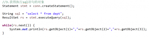 while(rs.next()) { // 部门编号(int) 部门名称(String) 部门地址(String) //目前处于第一行 /*int deptno = rs.getInt(1); String dname = rs.getString("dname"); String loc = rs.getString(3); System.out.println(deptno+"\t"+dname+"\t"+loc);*/ Object deptno = rs.getObject(1); Object dname = rs.getObject(2); Object loc = rs.getObject(3); System.out.println(deptno+"\t"+dname+"\t"+loc); } |