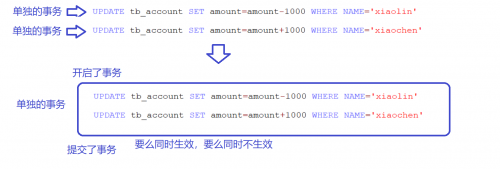 事务是一个最小的操作单元,不可再被分割,也就是说事务中的sql语句要么同时生效,要么同时不生效。