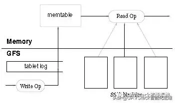 如图5所示,Tablet的持久化状态信息保存在 GFS 上。更新操作提交到REDO日志中。在这些更新操作中,最近提交的操作存放在排序的缓存中,我们称之为memtable;较早提交的操作存放在一系列SSTable中。恢复Tablet时,Tablet服务器首先从元数据表中读取其元数据。元数据包括组成Tablet的SSTable列表以及一系列的Redo标点。这些标点指向可能含有该Tablet数据的已提交日志记录。Tablet服务器把SSTable的索引读进内存,使用在Redo标点之后提交的更新重建memtable。