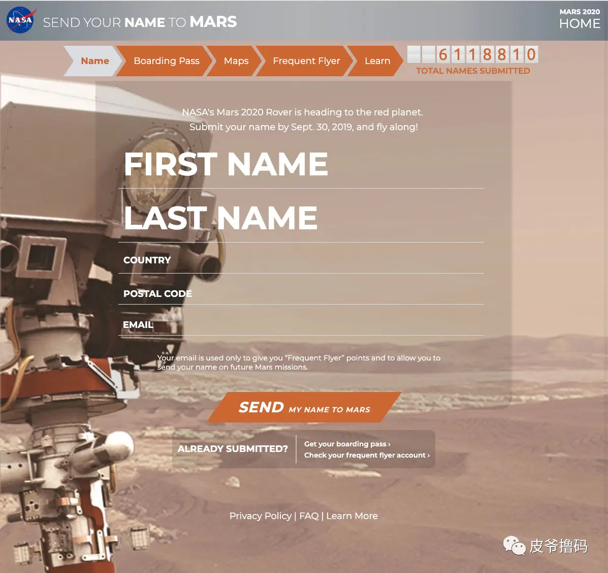 那就快去美国宇航局NASA的官网,填写活动表格,随后你的名字就会被刻到美国宇航局2020年的火星探测器的主板上,最终于2021年2月在火星着陆。