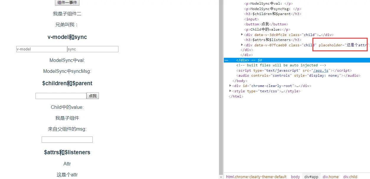 <AttrListen placeholder="这是个attr" :test="value" v-bind="$attrs" v-on="$listeners" @click="handleListen"/>