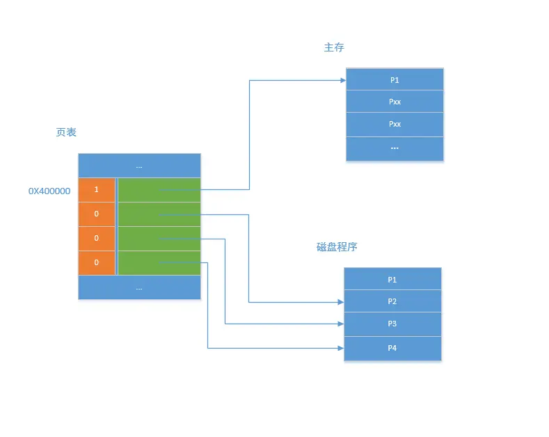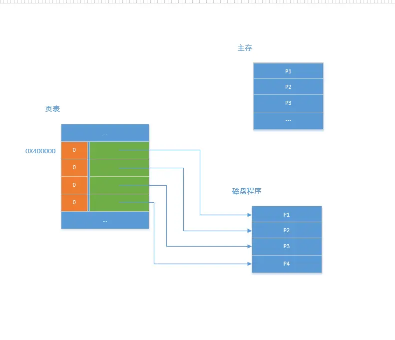 通过这样的一个模型,大大减轻了加载器的工作压力。加载也变成了一个看似很轻松的工作。这样子的模型看似可以良好的运行,可是却难免会遇到一个情况,假设我们现在仅有4G主存,而且假设4G空间都被占用了。现在一个程序申请4KB的空间,怎么办?计算机可能会想:"哦豁!完犊子,没空间了,直接报异常吧!"。通常情况还有另外一种解决办法,操作系统允许在磁盘上配置一定空间拓展主存(称为虚拟主存),这时操作系统会在主存中挑选一个或多个页调出主存,存储到虚拟主存中,修改对应的页表条目将其状态置为未缓存,并修改指针指向对应的磁盘地址。当程序再访问到这个页时再从磁盘调入主存。