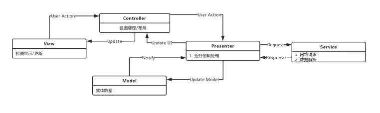 我们将业务逻辑交给presenter,网络请求交给service,那么这时controller的职责就变得很少了。只需负责视图初始化和实现
