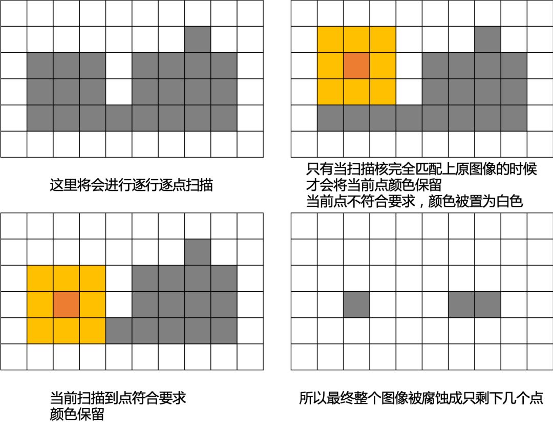 只有当原本的图像上对应核心周围所有的点都有值时,我们才保留当前核心的值。