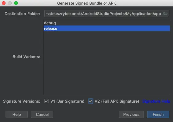 接着我们来选包(bundle)的类型。这里要选 “release”,因为它可以为我们生成一个生产环境的应用。我们还需要检查签名版本。