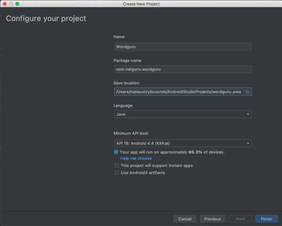 com.netguru.wordguru)。 - 保存位置(Save location):项目在本地的保存位置。