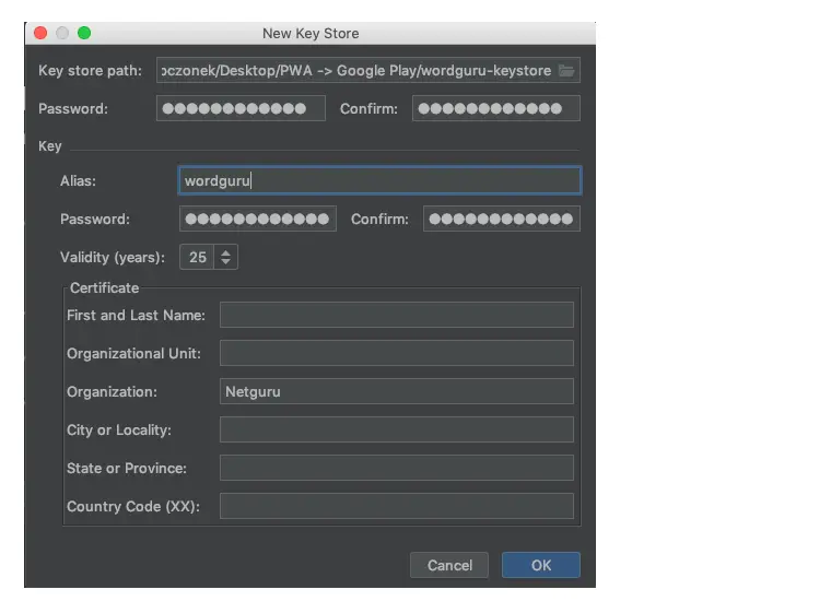 https://wordguru.netguru.com/)。 - 应用包名称(App package name):这是 TWA 的包名称(如