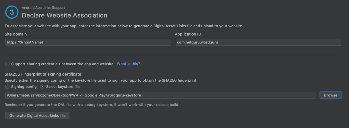 再回到 Android Studio,找到工具(Tools) → 应用链接助手(App Links Assistant)。来到第 3 步,“发起网站连接(Declare Website Association)”,填写所需信息:Site domain 和 Application ID。之后,选择上一步生成的密钥库文件。