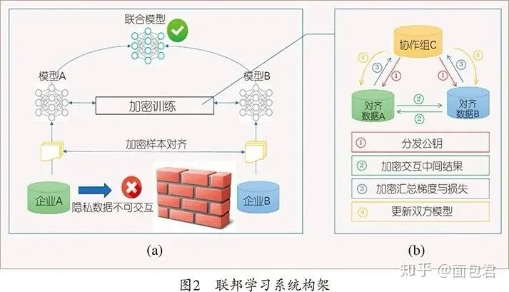 我们以包含两个数据拥有方(即企业 A 和 B)的场景为例介绍联邦学习的系统构架。该构架可扩展至包含多个数据拥有方的场景。假设企业 A 和 B 想联合训练一个机器学习模型,它们的业务系统分别拥有各自用户的相关数据。此外,企业 B 还拥有模型需要预测的标签数据。出于数据隐私保护和安全考虑,A 和 B 无法直接进行数据交换,可使用联邦学习系统建立模型。联邦学习系统构架由三部分构成,如图 2(a) 所示。