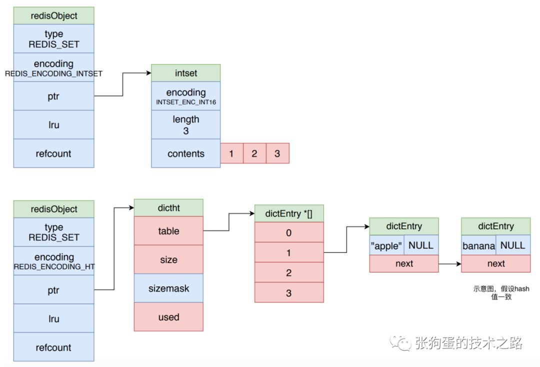 而使用 dict 进行编码时,字典的每一个键都是一个字符串对象,每个字符串对象就是一个集合元素,而字典的值全部都被设置为NULL。如下图所示。