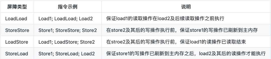 JVM中提供了四类内存屏障指令: