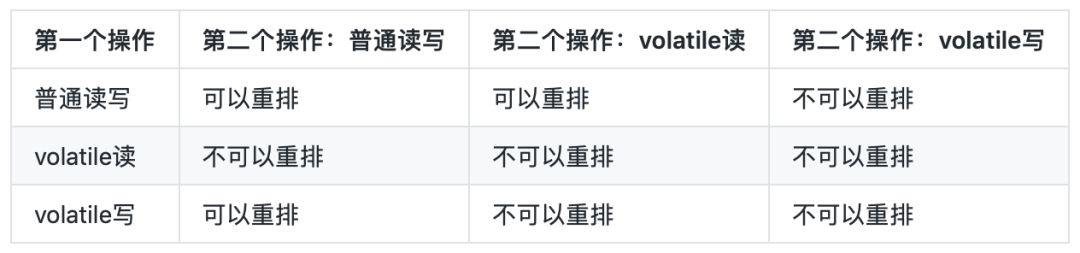 下面的表是volatile有关的禁止指令重排的行为: