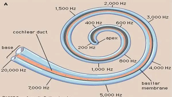高频声音会被耳蜗近根部位置所感知,低频声音在近端部位置被感知,因此人对不同频率声的感受是非线性的,这是后续声学计权的基础。
