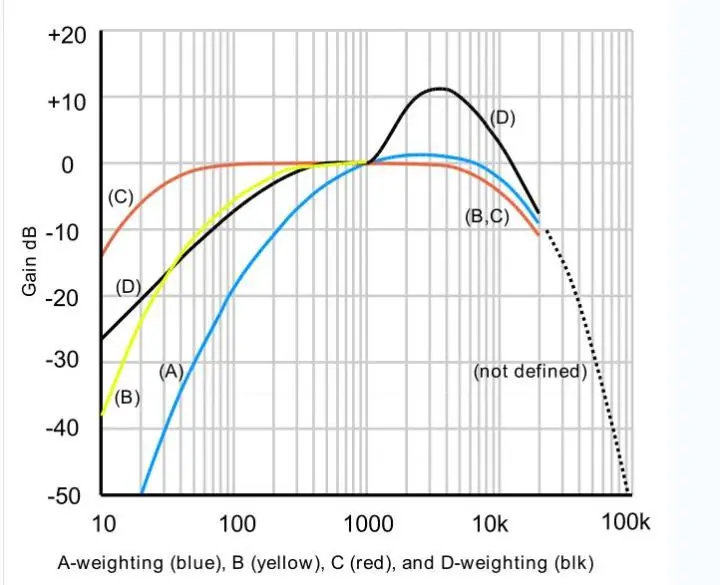 频率计权是作用在音频信号的频谱上的,常用的有:A、B、C、D四种: